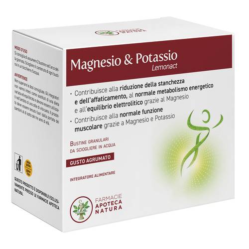 Magnesio & Potassio Lemonact Descrizione Integratore alimentare di magnesio e potassio. Contribuisce alla riduzione della stanchezza e dell’affaticamento, al normale metabolismo energetico e all’equilibrio elettrolitico grazie al magnesio. Contribuisce alla normale funzione muscolare grazie a magnesio e potassio. Gusto agrumato. Ingredienti Zucchero di canna, Lemonact Cospray (limone succo concentrato – titolato in acidità totale come acido citrico monoidrato 23%, potassio cloruro, magnesio carbonato, gomma d’acacia), aroma naturale, olio essenziale di arancio dolce. Senza edulcoranti di sintesi e glutine. Caratte...